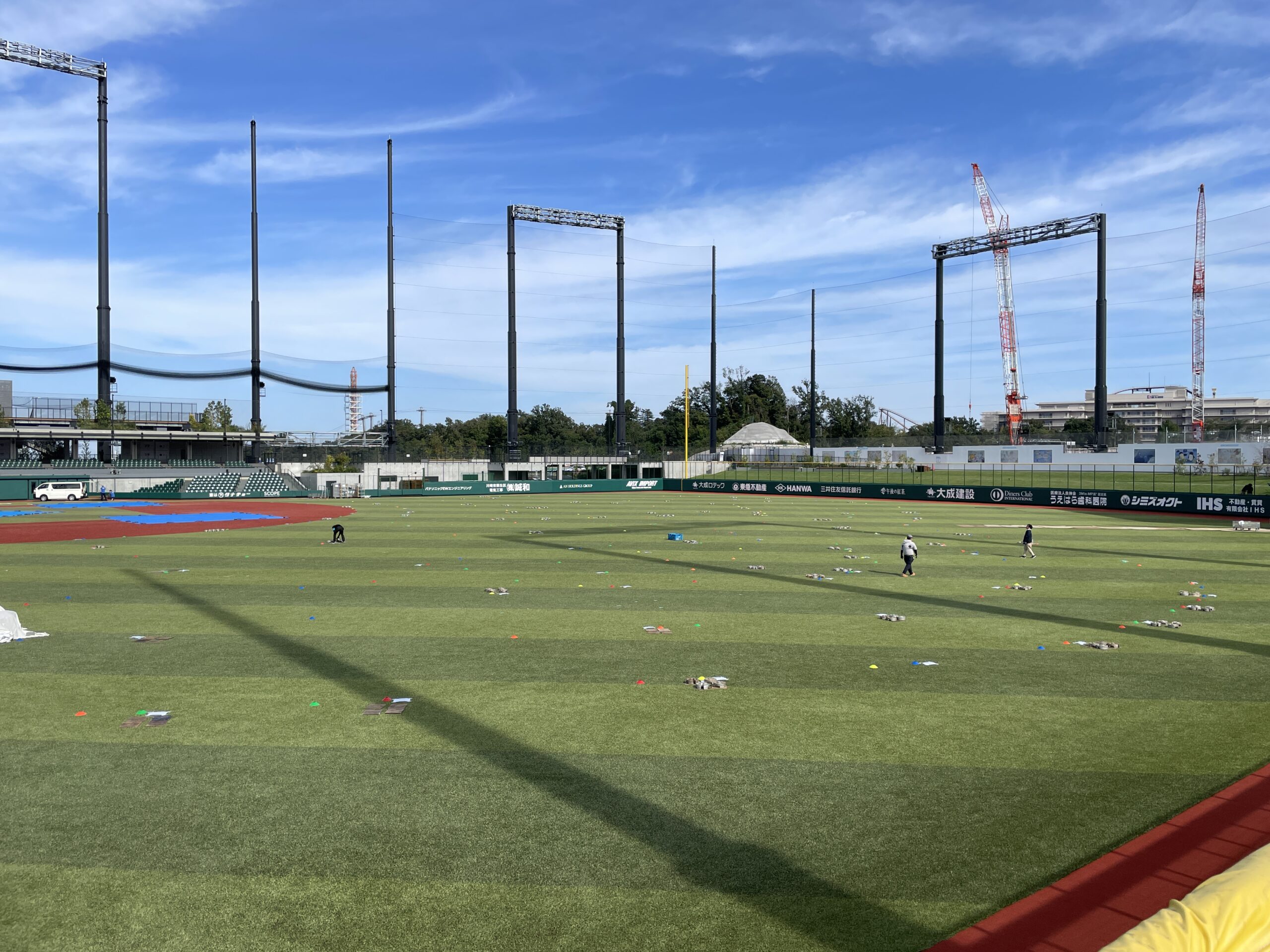 本日から会場となるGIANTS TOWN STADIUMにて、開催に向けた準備が始まりました! 今日は私たち運営メンバーの中で「墨出し」と呼んでいる作業がメイン。内容を簡単にお伝えすると、出店者のブース位置を配置図と照らし合わせながら、ロードメジャーでサイズを測り、カラーコーンで場所を定める、といった作業になります。地道な作業ですが、イベントの空間づくりの一環として、非常に重要な要素。手紙社のイベントではブースを組み合わせて曲線をつくり「その先に何があるだろう」というワクワクを感じてもらえることを目指して配置をしています。そんなポイントを頭の片隅に少しでも入れていただけたら、運営冥利に尽きるというものです。