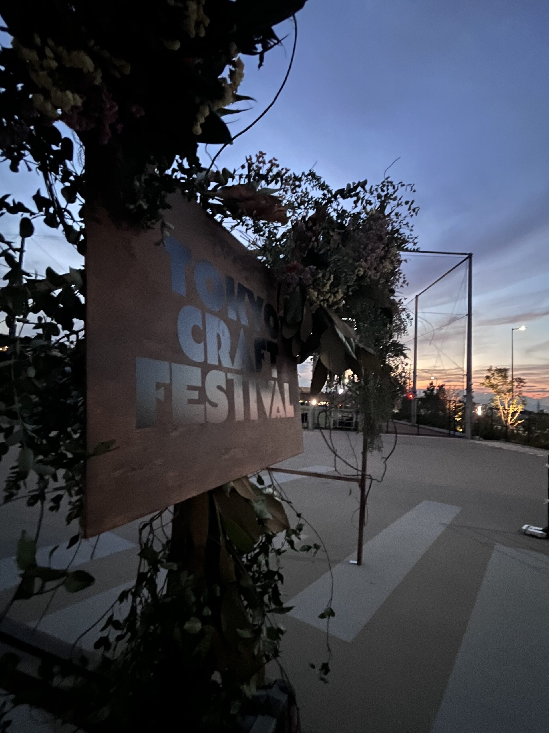出来上がった入場ゲートをチラ見せ。夕日に照らされる姿が華やかで美しく、ぜひ早くみなさんにも見ていただきたいです! さあ、いよいよ明日から東京クラフトフェスティバルが始まります。作り手、GIANTS TOWN STADIUM、事務局、クラフェスに関わってきた全員の集大成をご覧あれ!