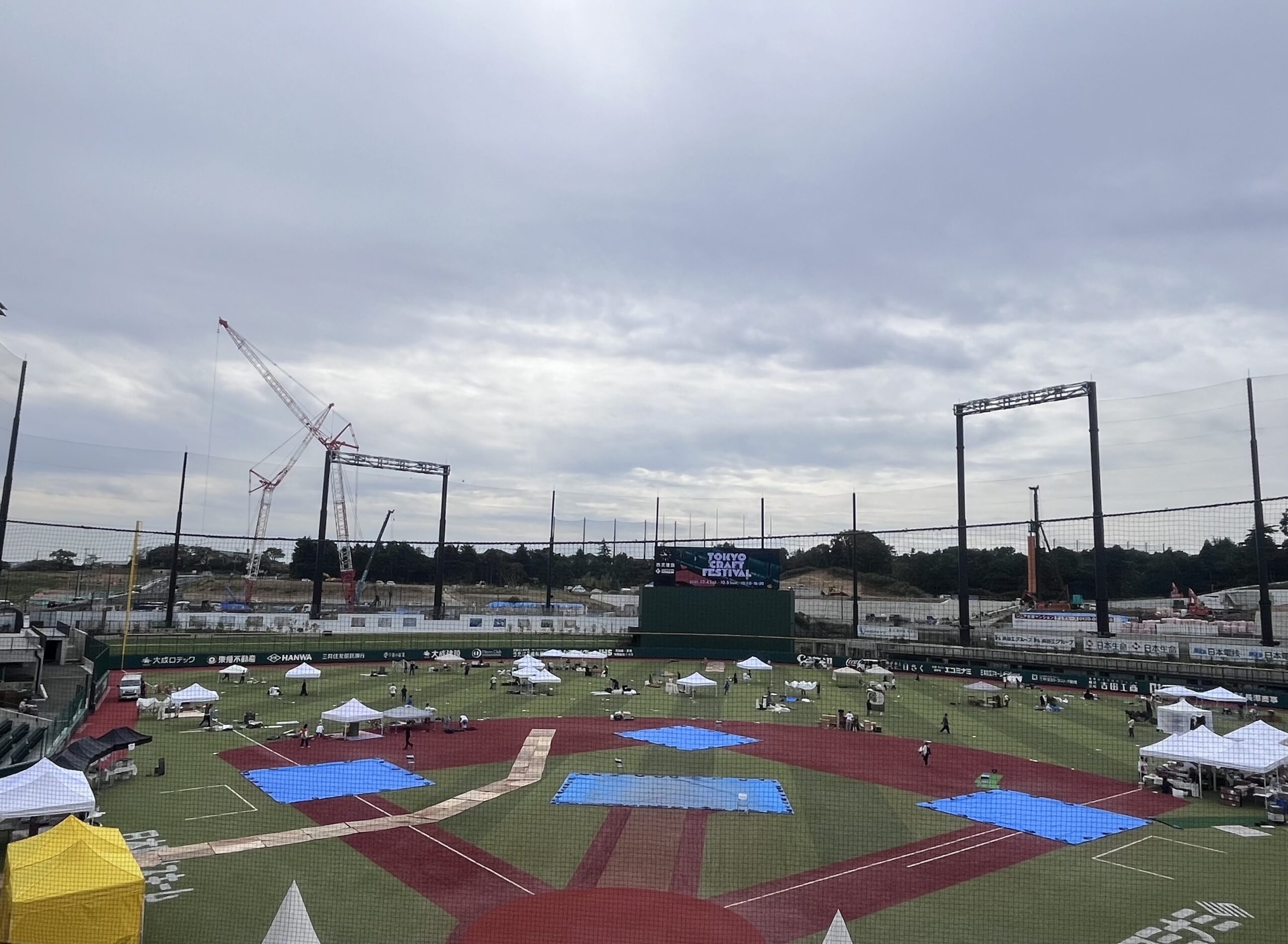 こんばんは! クラフェス事務局のナガオカです。本日は東京クラフトフェスティバル搬入日。出店者のみなさんがテントを立て、作品を並べ、ご来場いただくみなさんをお迎えする準備の日です。写真のように区画された場所に作り手のテントが立っていき、全てが並ぶ頃には、まるで夢の国のような高揚感に溢れ、胸高まる空間となるのです。この球場にテントが立ち並ぶ姿は圧巻! 完成形を見られるのは、今週末だけですのでぜひ足をお運びくださいね。